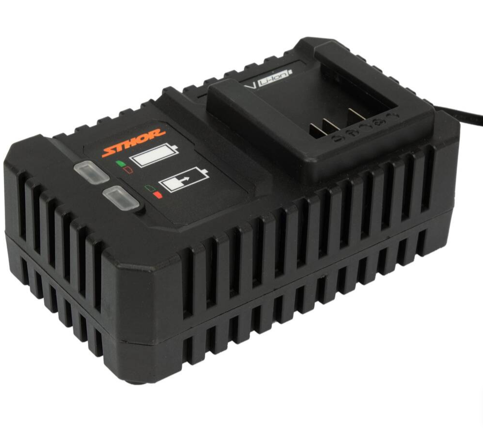 Γρήγορος φορτιστής για μπαταρίες Sthor 20V. Λειτουργεί στα 4A. Φορτίζει μια μπαταρία 2Ah σε περίπου 30 λεπτά και μια μπαταρία 4Ah σε 60 λεπτά. Απενεργοποιείται αυτόματα μετά την ολοκλήρωση της φόρτισης. Η συσκευή διαθέτει διαγνωστική λειτουργία – εάν εντοπιστούν κατεστραμμένα στοιχεία μπαταρίας, σταματά τη φόρτιση και το ειδοποιεί με ένα παλλόμενο κόκκινο LED.