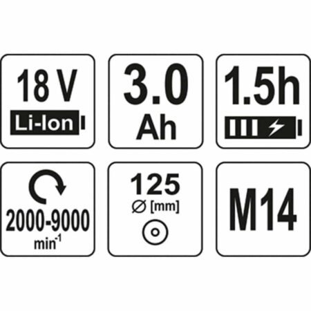Περιλαμβάνεται: Γωνιακό τροχό, μπαταρία 18 V 3 Ah Li-Ion, γρήγορος φορτιστής (1,5 ώρα για μπαταρία 3 Ah), βολική βαλίτσα